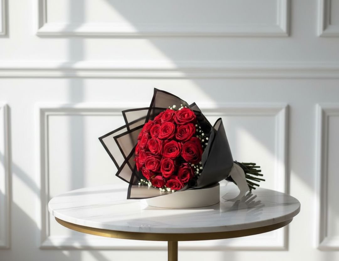 | ٢٥ وردة بتغليف بسيط وشريطة أنيقة، مظهر منعش وكلاسيكي. |