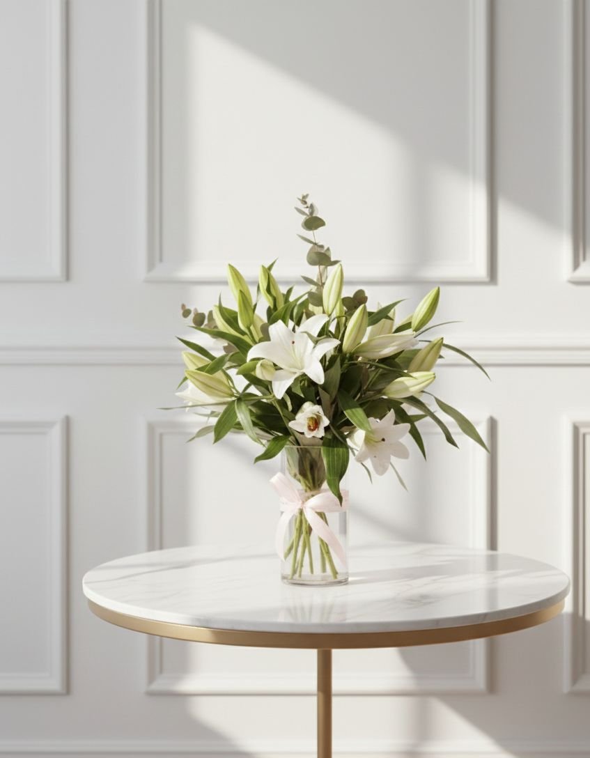 | A graceful bouquet of 10 lilies with greenery, arranged in a beautiful vase and tied with a ribbon. |