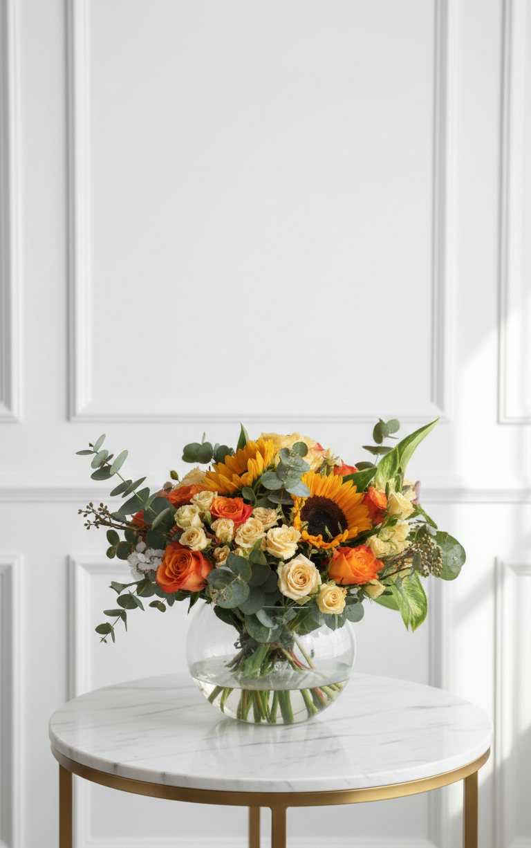 | 🌸 Elegant vase arrangement with 10 roses, 2 sunflowers, 10 baby roses and accent greens in a glass vase. |