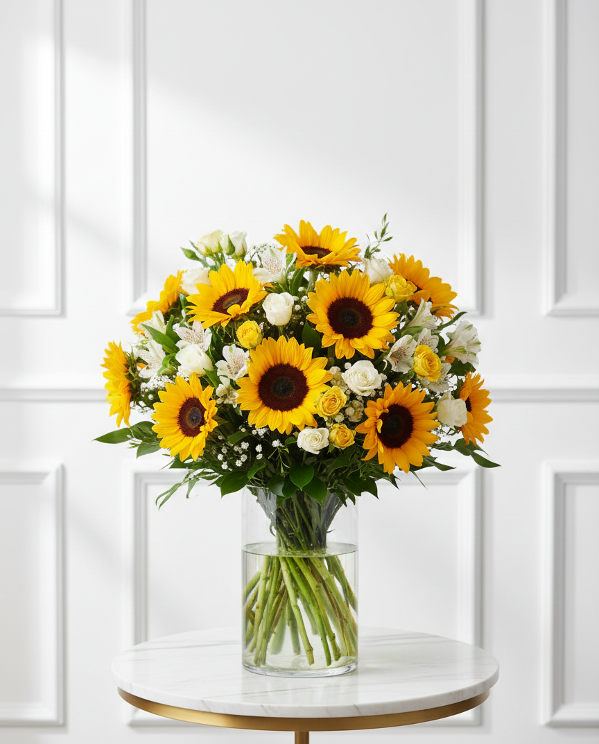 | 🌸 Elegant vase arrangement with 15 sunflowers, 10 baby roses and accent greens in a glass vase. |