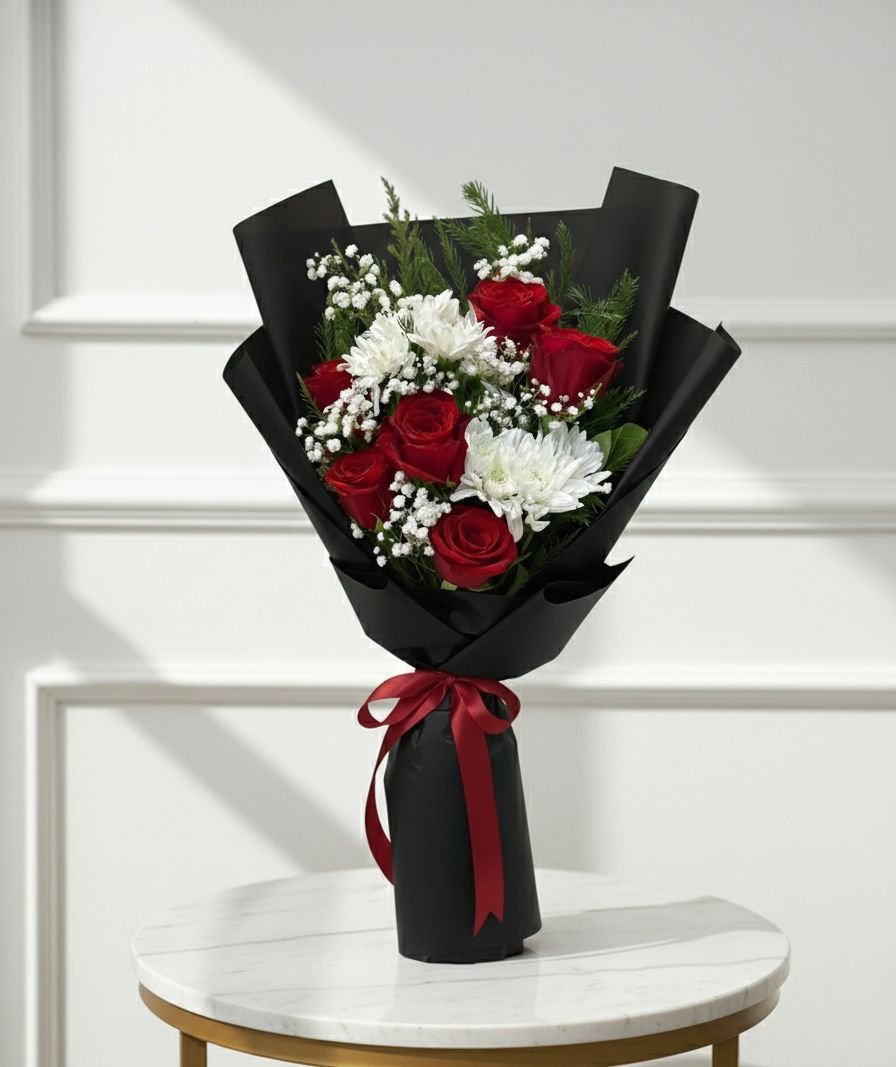 | ٢٥ وردة بتغليف أنيق وشريطة مرتبة، لمسة كلاسيكية متكاملة. |