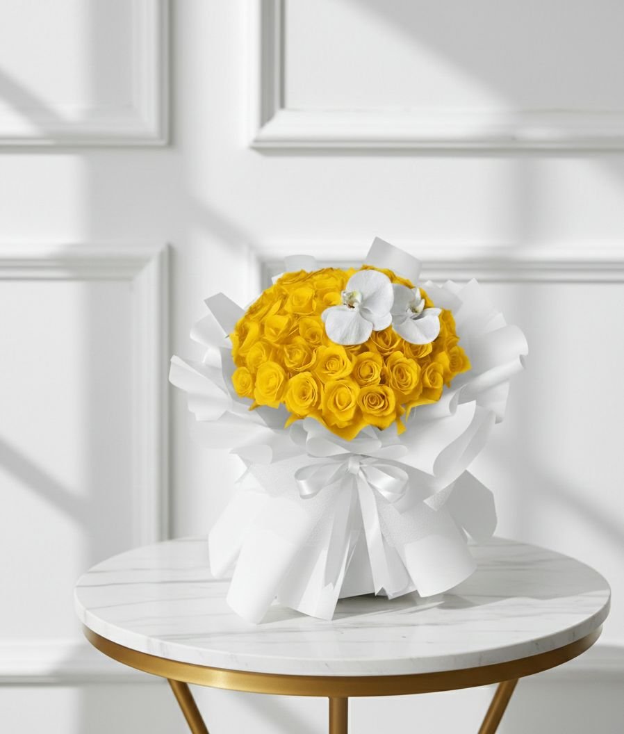| باقة ناعمة تضم 1 هيدرانجيا، 1 ليلي، 5 وردات، 1 كريس، 1 أستروميريا، و1 واكس مع 5 قطع من اللمسات الخضراء الطبيعية، مغلفة بورق التغليف والشريط. |