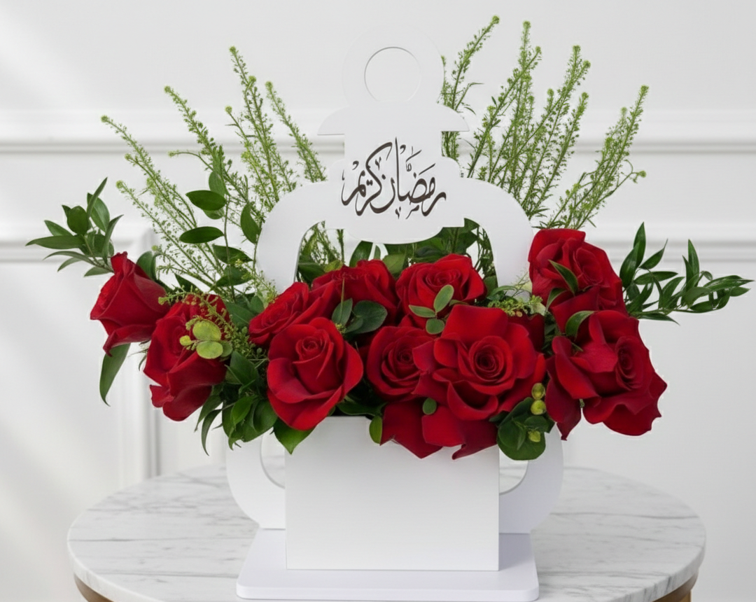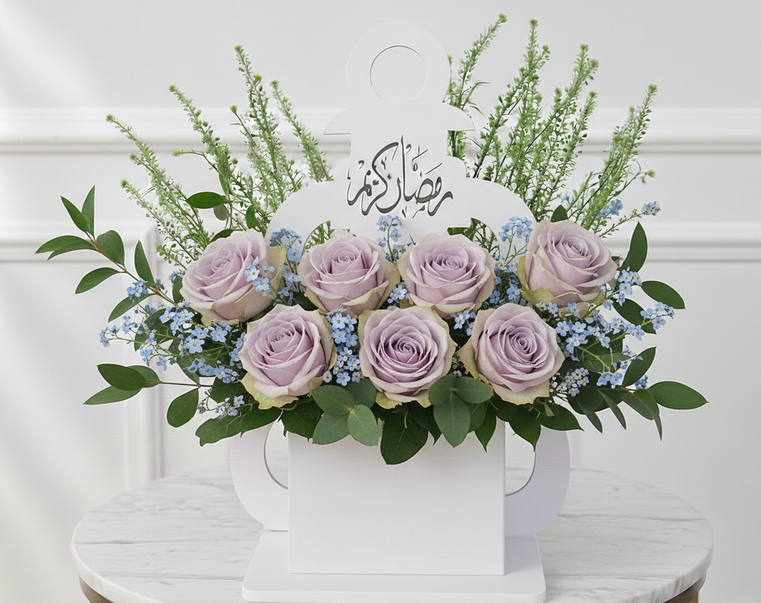 تنسيق فاخر من 7 هدرنجيا، جبسوفيلا، خضار طبيعي، فانوس، وصندوق فاخر.