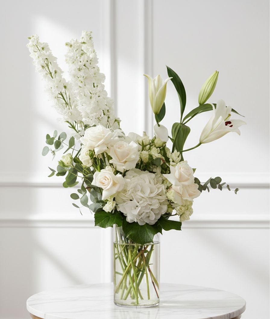 | باقة مختلطة من دلفينيوم، 10 وردات، هدرنجيا، بيبي روز، وأوراق خضراء طازجة، مرتبة بأناقة في مزهرية أنيقة. |