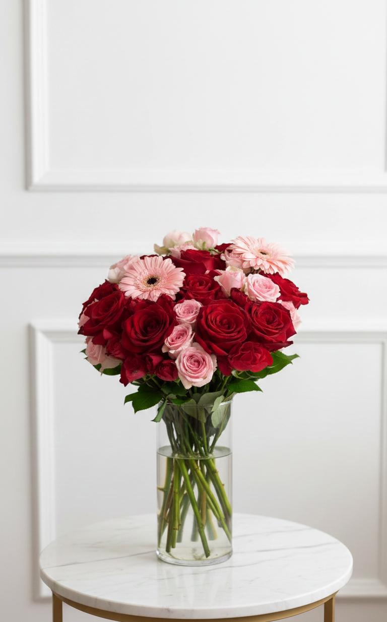 🌸 تنسيق فازة أنيق يضم 20 ورد جوري، 3 بيبي روز و2 جيربرا داخل فازة زجاجية.