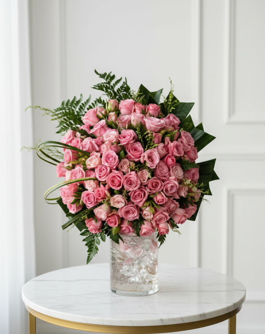 | 🌸 تنسيق فازة أنيق يضم 5 باقات بيبي روز مع لمسات من الإكسسوارات الخضراء داخل فازة زجاجية. |