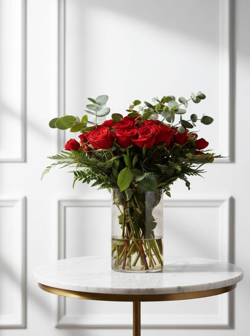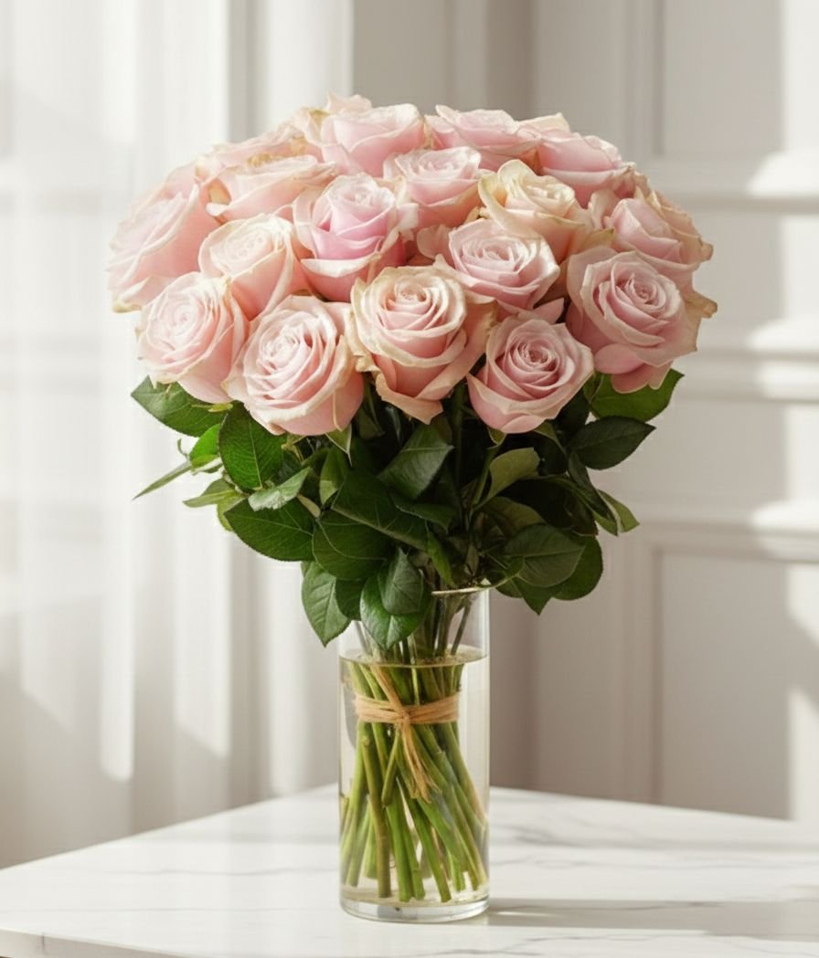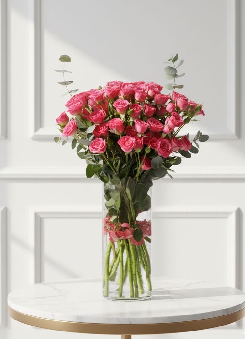 | تنسيق أنيق يضم 15 بيبي روز مع 3 أوركيد ولمسات خضراء مميزة، مرتبة داخل فازة راقية |