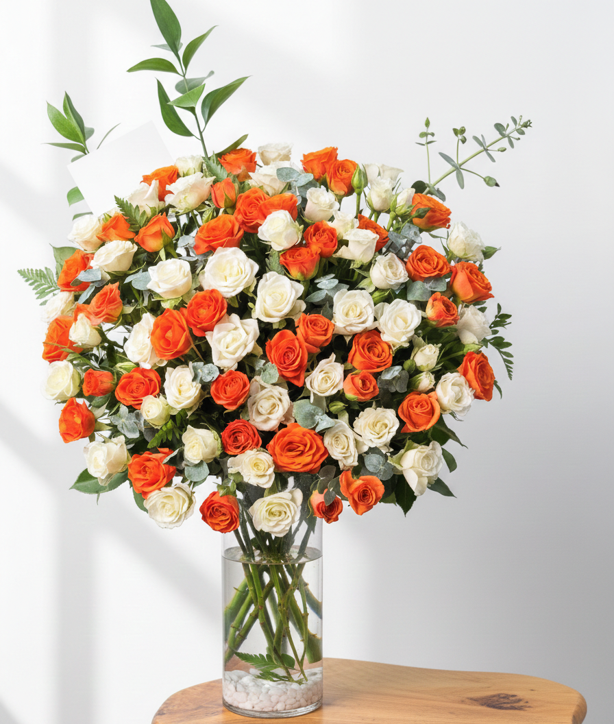 | تنسيق فاخر يضم 4 ربطات بيبي روز مع لمسات خضراء طبيعية، مرتبة داخل فازة أنيقة لإطلالة مميزة وممتلئة. |