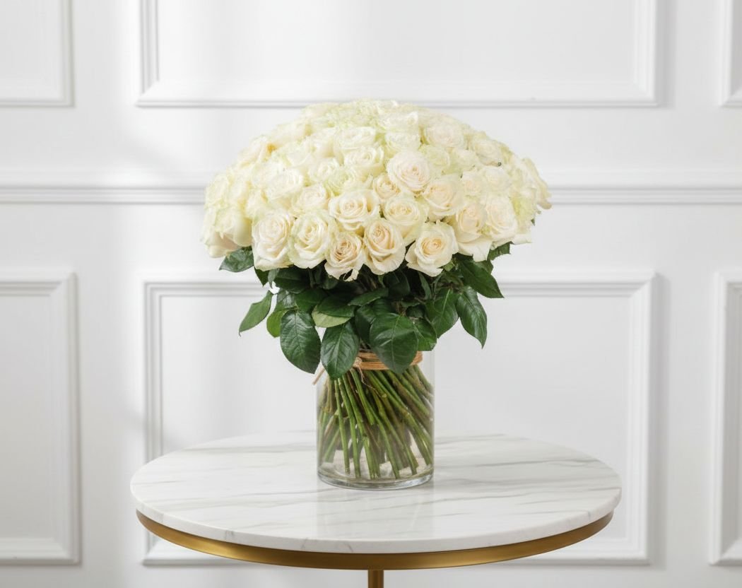 | تنسيق ناعم يضم 10 وردات مع 3 ليلي ولمسات أكسنت خضراء داخل فازة أنيقة، مناسب للهدايا البسيطة والمميزة. |
