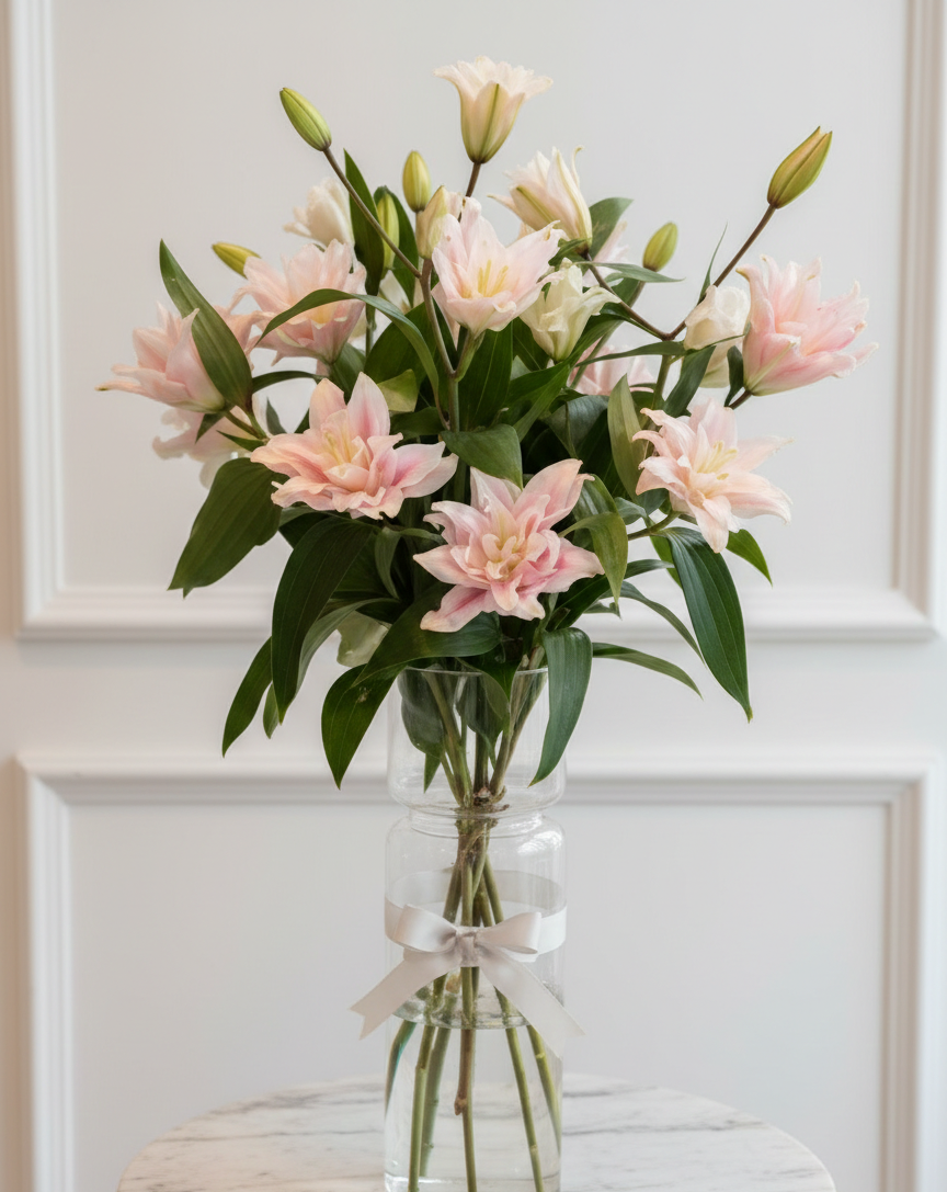 | تنسيق أنيق يضم 6 زهور ليلي مرتبة داخل فازة راقية، مناسب للهدايا الفاخرة والمميزة. |